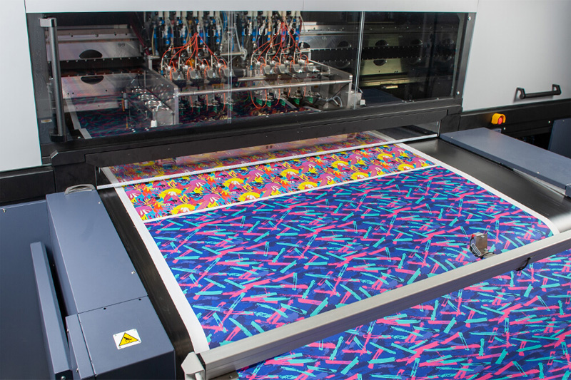 Once under the screens, the fabric stops. The screens are lowered and then the automatic squeegee moves across each screen pushing print paste through the design or open areas through the screens. The screens are raised, the blanket precisely moves the fabric to the next color and the process is repeated. Once each color has been applied the fabric is removed from the blanket. The fabric moves through the required fixation process. The rubber blanket is continuously washed, dried, and rotated back to the fabric infeed area.
