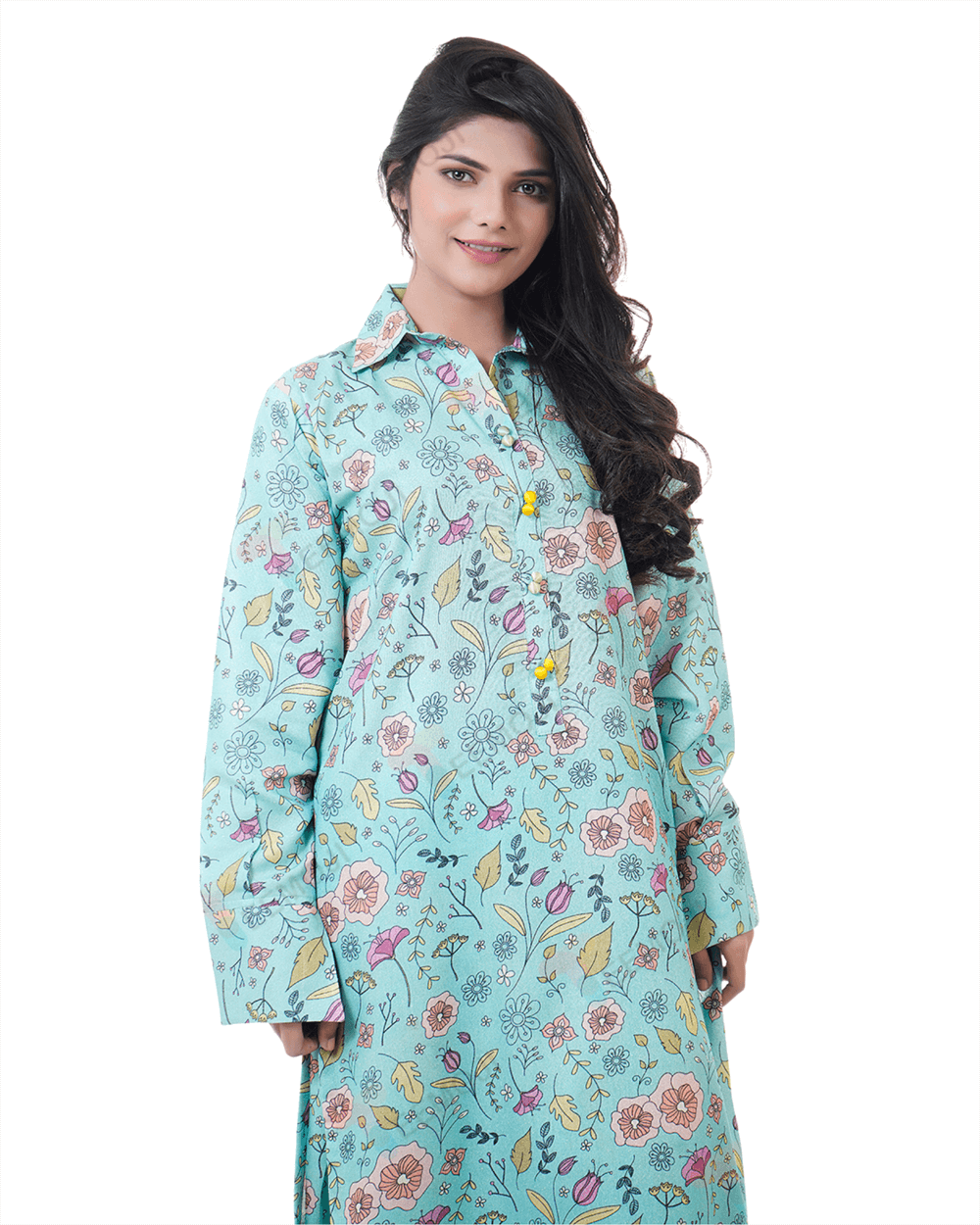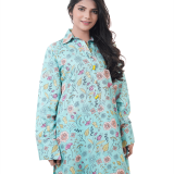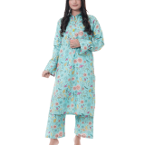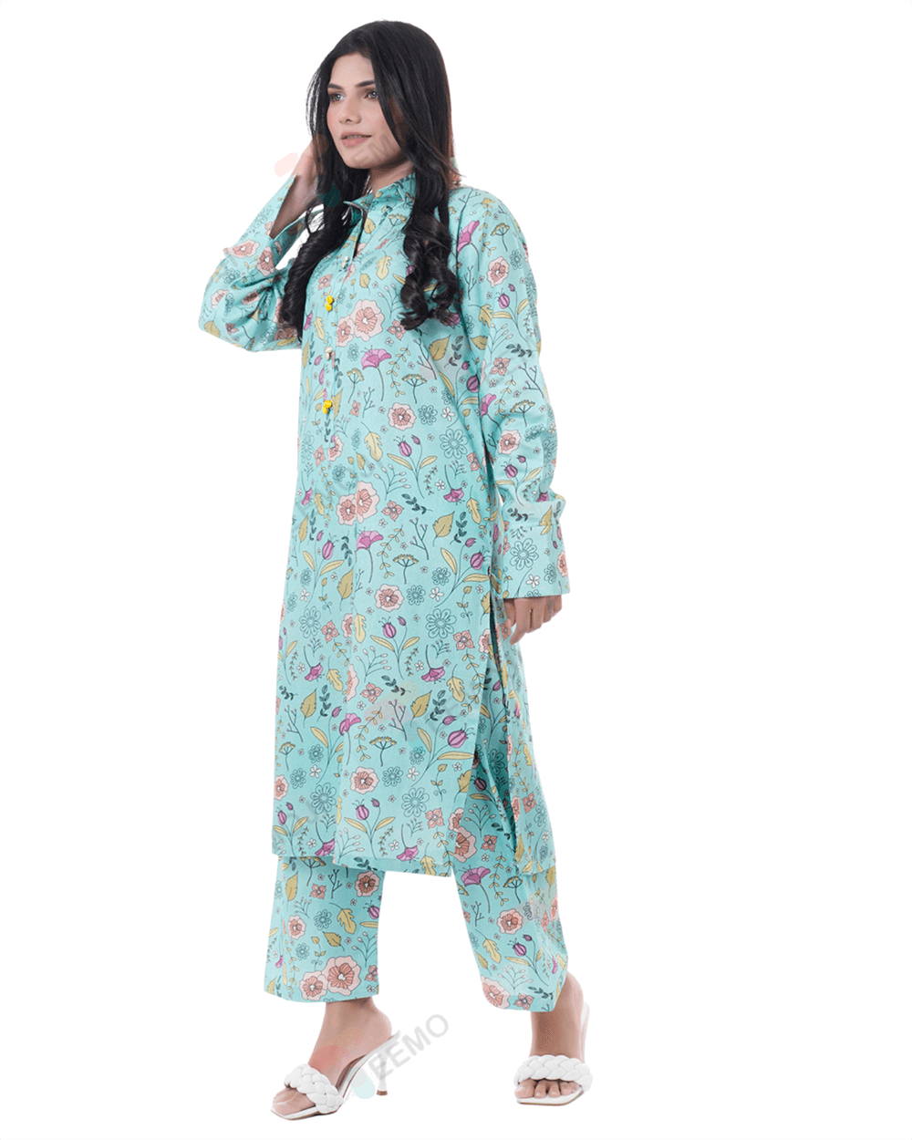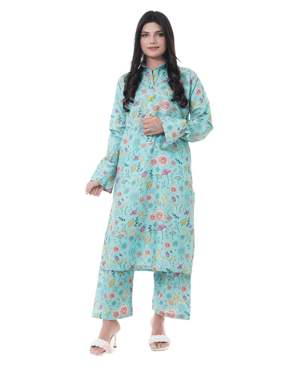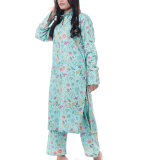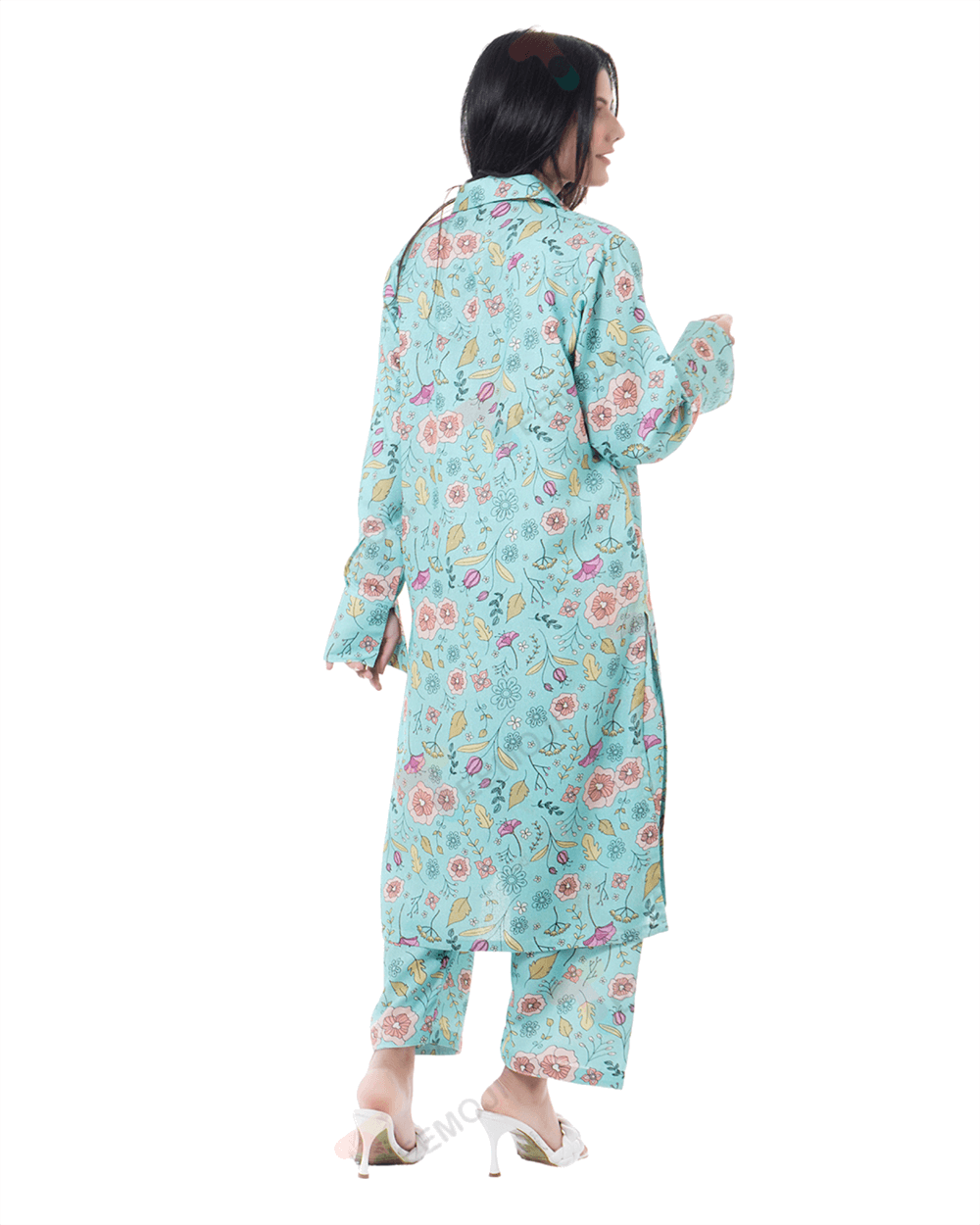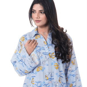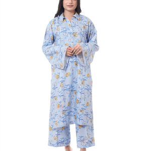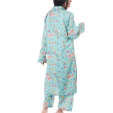 An enchanting composition is layered over this graceful ensemble portrayed in a gleaming ice blue shade. It depicts a contemporary silhouette shirt adorned with captivating floral prints in vibrant colors. Paired with a matching trouser, this aesthetically rich outfit is a great option for day events this season.