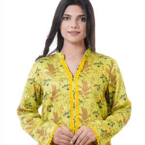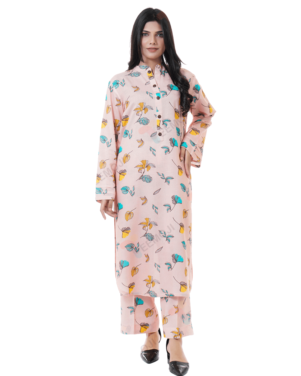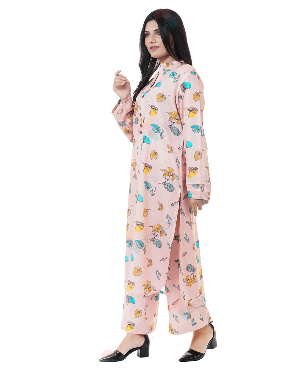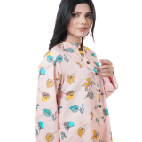 An enchanting composition is layered over this graceful ensemble portrayed in a gleaming ice blue shade. It depicts a contemporary silhouette shirt adorned with captivating floral prints in vibrant colors. Paired with a matching trouser, this aesthetically rich outfit is a great option for day events this season.