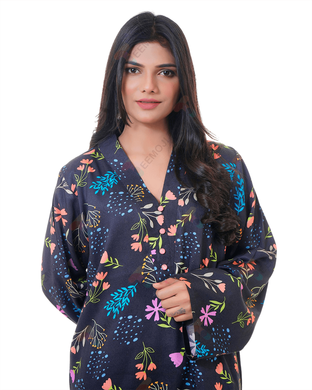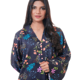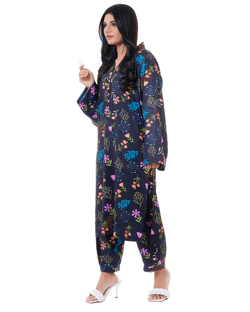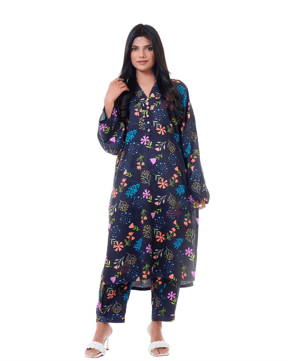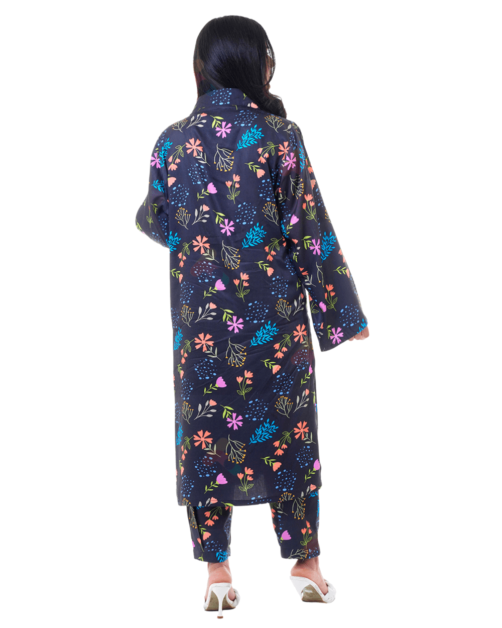 An enchanting composition is layered over this graceful ensemble portrayed in a gleaming ice blue shade. It depicts a contemporary silhouette shirt adorned with captivating floral prints in vibrant colors. Paired with a matching trouser, this aesthetically rich outfit is a great option for day events this season.